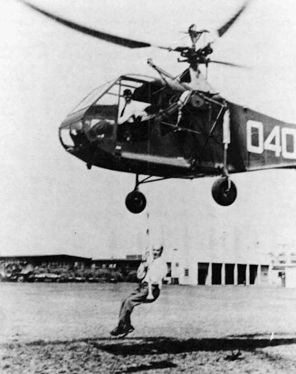 Cdr Frank Erikson USN hovers the YR-4 with the first rescue hoist fitted. Igor Sikorsky is in the sling. In January 1944 Cdr Erikson piloted one of the first helicopter life-saving missions following an explosion in a destroyer off the New Jersey coast