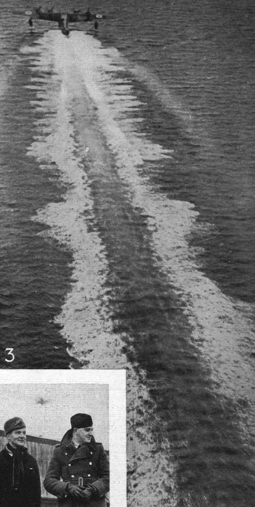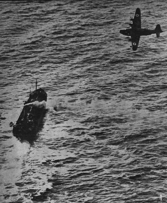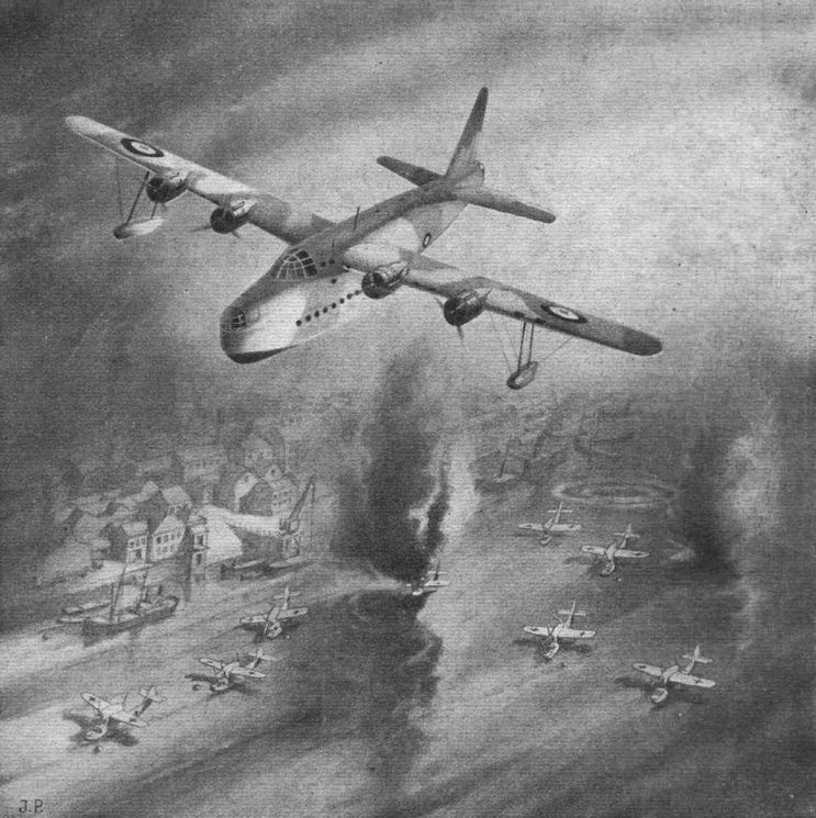 OUT OF THE SUN. A Short Sunderland attacks Dornier Do.18s at moorings. German flying boats have proved no match for this formidable R.A.F. machine, which outflies and outfights them whenever contact is made.