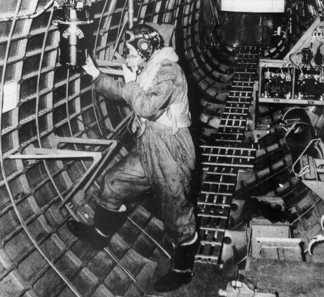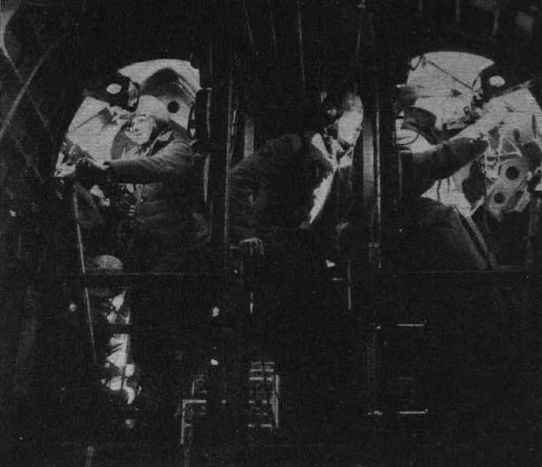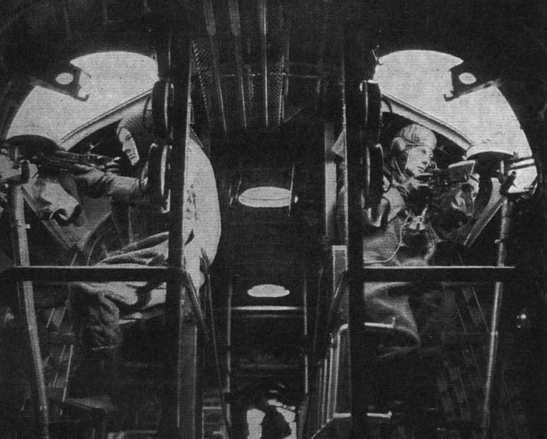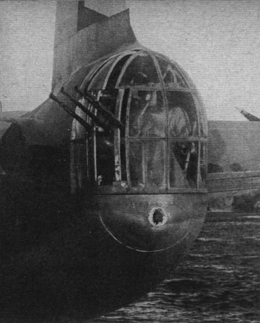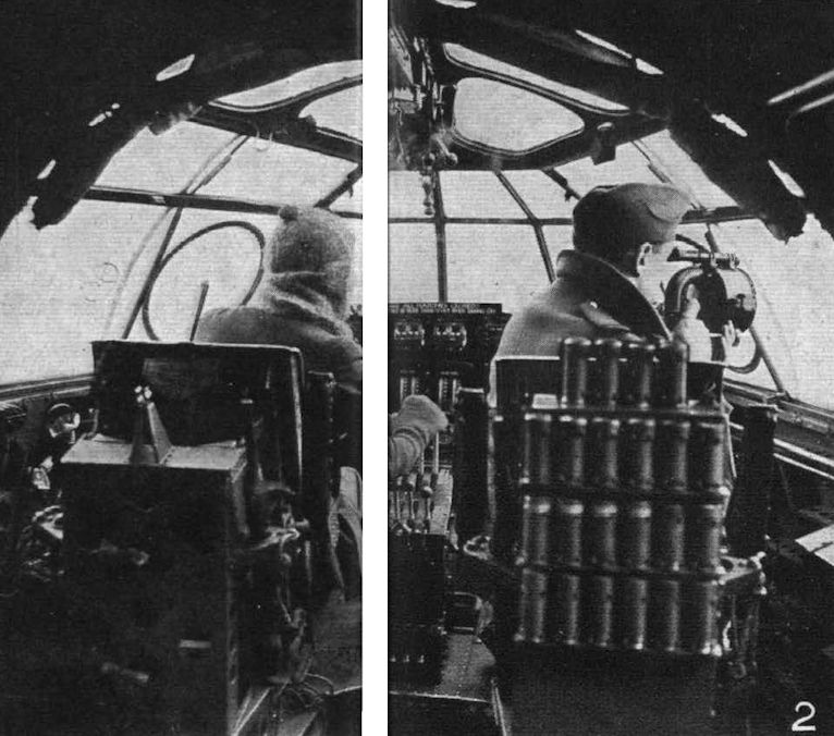 In the nose, beneath the retractable gun turret, is situated the bomb-aimer's position. To be able to sit comfortably and have plenty of room must have a good effect on results.