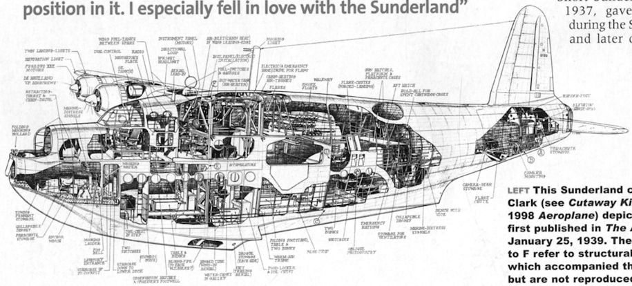 This Sunderland cutaway by J.H. Clark depicts a Mk I. It was first published in The Aeroplane of January 25, 1939. The circled labels A to F refer to structural detail sketches which accompanied the original drawing but are not reproduced here.