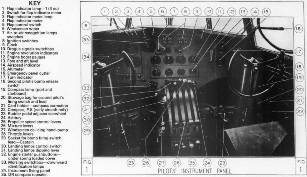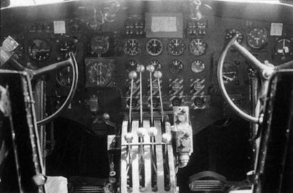 1939 photograph of a 201 Sqn Sunderland flight deck taken during the escort flight for the French President's visit to the UK. The cylinders in the rack behind the second pilot are Very cartridges, not cans of booze.