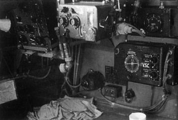 View of a Sunderland cockpit. The wireless operator's desk can be seen at near left; the navigator's station was at near right. The cylinders at right are Very pistol cartridges.