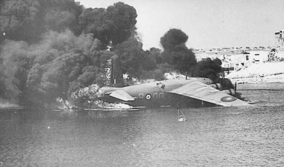 A 202 Squadron Sunderland lies burning in Kalafrana Harbour following an enemy air attack. The Photo Section was only a few hundred yards away.