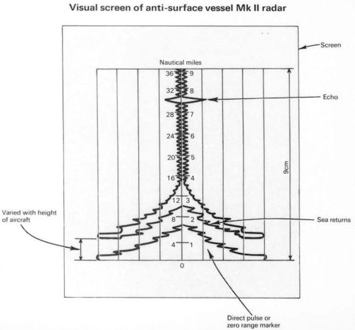 This example of an ASV Mk II radar display shows an object ahead, on the homing aerials, slightly to starboard. Homing beacons showed as rectangular blips, flashing the station letters in Morse code. The instrument could be switched to short range (mile intervals), medium range (4-mile intervals), or long range (10-mile intervals), as shown on the vertical scale. Maximum range was about 90 miles.