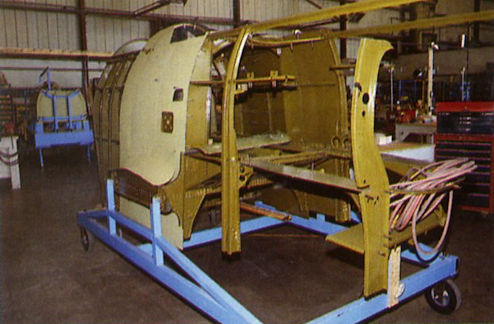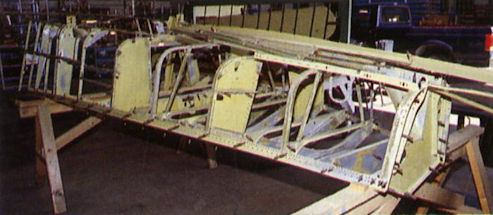 The partly-restored fuselage frame of the Grumman Duck, resplendent in green primer.