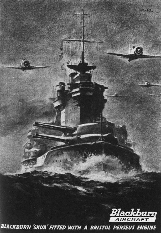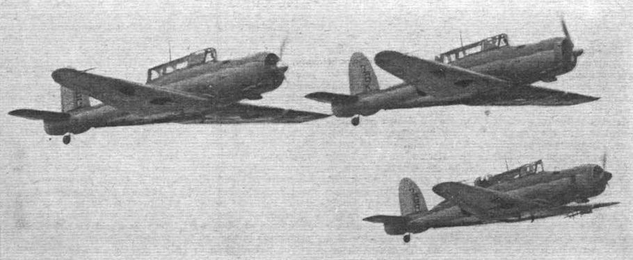 NAVAL DIVE-BOMBERS: Blackburn Skua fleet fighter dive-bombers (Bristol Perseus XII sleeve-valve engine). The Skua has a top speed of 225 m.p.h. and as a fighter is armed with five machine guns, four being fixed in the wings.