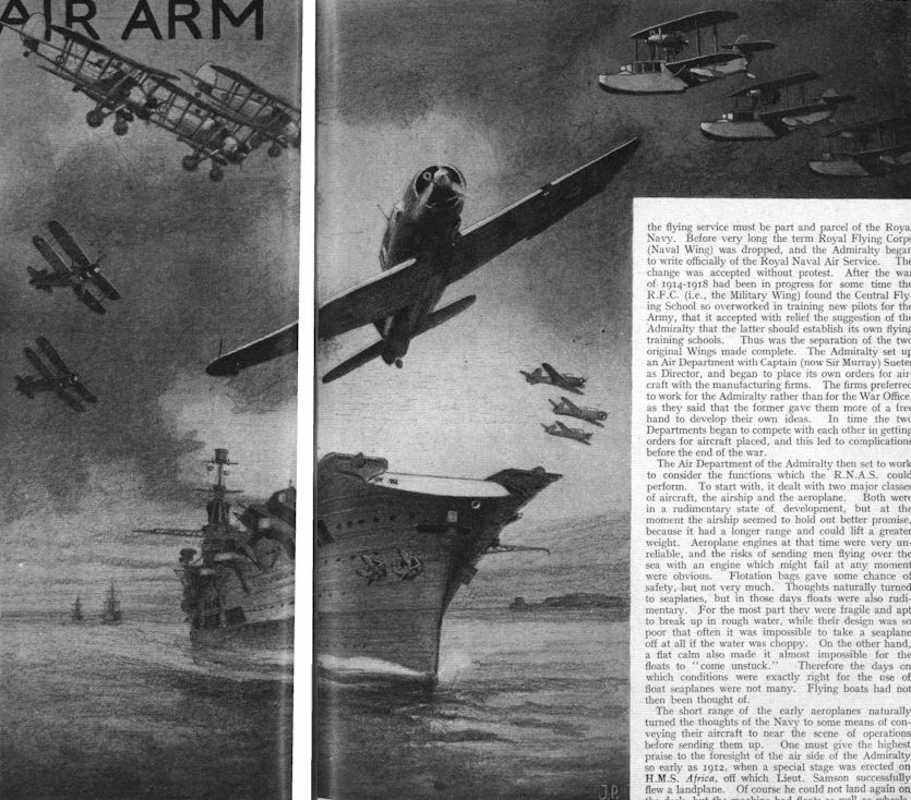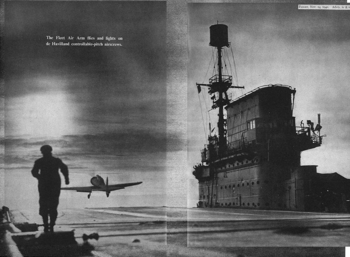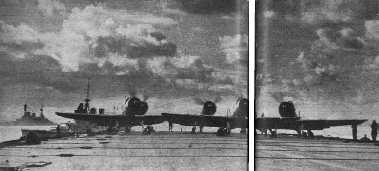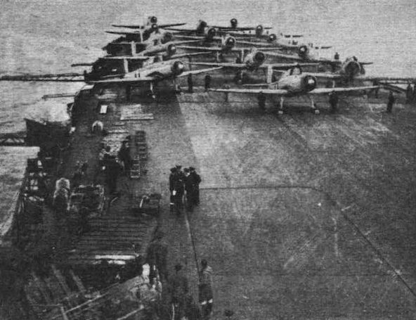 ENGLAND'S DIVE BOMBERS: Fifteen Blackburn Skuas with engines ticking over waiting for the take-off signal. Note the ship's radio aerial masts at right angles to the deck and the multiple pom-pom in the foreground.