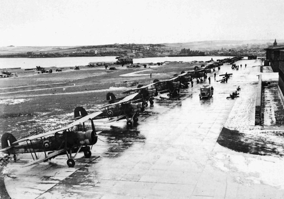 Royal Naval Air Station, Hatston, looking east towards Kirkwall. Apart from the line of sixteen Swordfish, visible on the left is a Henley and two Skuas of No.771 Squadron, the Fleet Requirements Unit at Hatston
