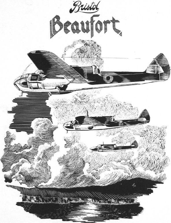 BRISTOL BEAUFORT. Britain's newest multi-purpose machine. It has two Taurus sleeve-valve engines and can be used for torpedo-dropping.