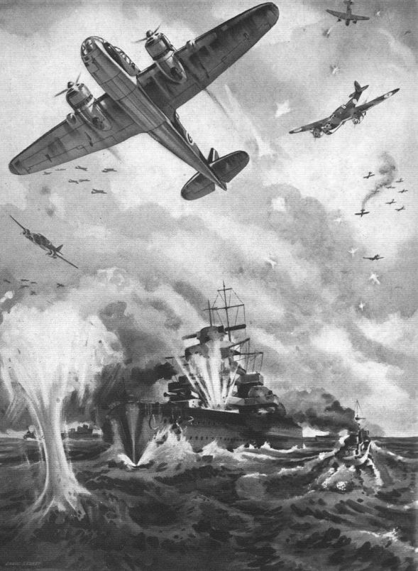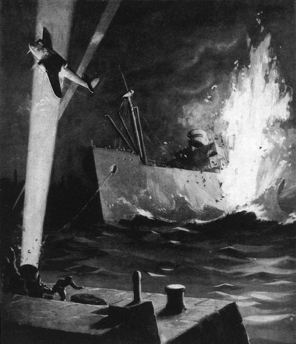 A "Bristol" Beaufort torpedoing a 5,000-ton German transport from a height of only 50 ft. and extinguishing by machine-gun fire the searchlight which picked it up.