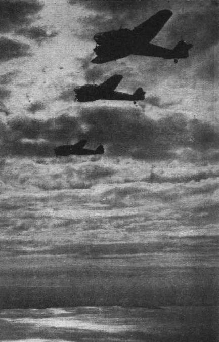 MULTI-PURPOSE ELEGANCE: Coastal Command Beauforts in "echelon to the right" under a cloud layer. Beaufort is a high performance general purpose aircraft powered by two 1,000 h.p. Bristol Taurus sleeve-valve engines. It is in large-scale production at home and in the Dominions.