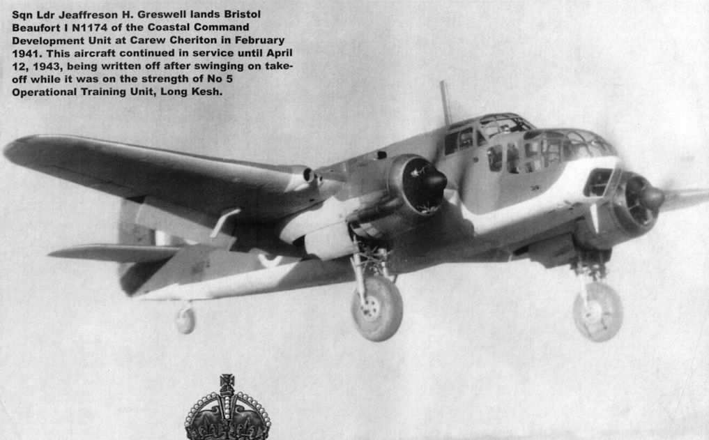 Регистрационный номер: N1174 Sqn Ldr Jeaffreson H. Greswell lands Bristol Beaufort I N1174 of the Coastal Command Development Unit at Carew Cheriton in February 1941. This aircraft continued in service until April 12, 1943, being written off after swinging on takeoff while it was on the strength of No 5 Operational Training Unit, Long Kesh.