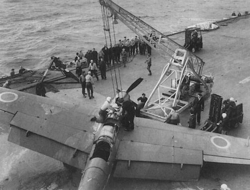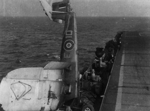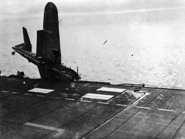 Регистрационный номер: LS796 [2] Barracuda II LS796 of 767 Sqn about to take the final plunge - note that the tailcone has been ripped off.