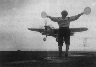 Ravager’s batsman guides a “Barra” to the deck, April 1944.