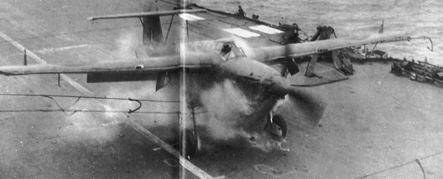 Против линкора "Тирпиц". Задачей начатого 3 апреля 1944 года рейда морской авиации против "Тирпица", стоявшего в Каар-фьорде на севере Норвегии, была нейтрализация этого линкора, угрожавшего конвоям в Россию. С задействованных в рейде шести авианосцев Королевского флота взлетели 42 Barracuda из четырех эскадрилий с авианосцев "Викториес" и "Фьюриес", а также 80 истребителей сопровождения. Линкор "Тирпиц" получил 15 прямых попаданий 227-кг и 454-кг бомб, сброшенных Barracuda; были потеряны только три пикировщика и один истребитель. На снимке - Barracuda, вернувшийся на авианосец после рейда. В дальнейшем удары по "Тирпицу" наносились в мае, июле и августе.