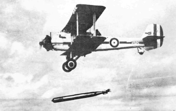 Регистрационный номер: K2814 [2] It was not possible to show the public any actual torpedo dropping at Gosport on Empire Air Day, but this picture, secured beforehand, depicts the "tinfish" a moment after its release.