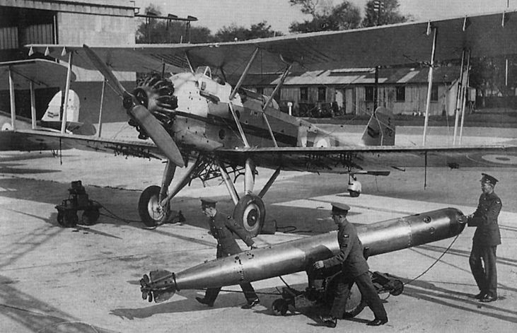 "MILITARY LOAD" - AND MORE. An 18-in. torpedo and an assortment of bombs on a Vickers "Vildebeest" torpedo bomber. Bombs and torpedo are alternative loadings. It is not possible to carry both at the same time.