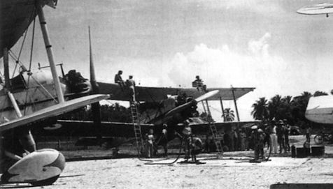 SAME WEAPON, DIFFERENT ELEMENTS: A Vickers Vildebeest used for training pilots in the art of torpedo-dropping seen over a British submarine which also specialises in attacks with torpedoes. These are of heavier patterns.