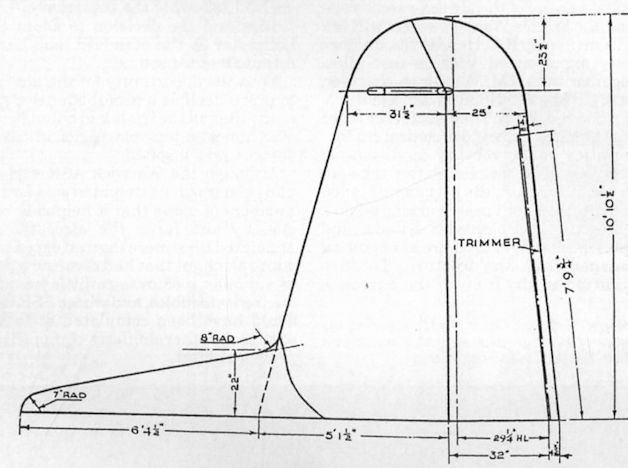 The revised fin and rudder with the added dorsal fin. Although rudder overbalance was eliminated, other problems arose.