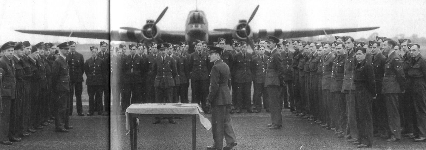On D-Day minus 3, June 3, 1944, 280 Sqn formed up in a hollow square in front of one of their ASR Warwicks, freshly painted with black-and-white invasion stripes, awaiting a special briefing from the AOC of No 16 Group, Air Cdre Frank Hopps. Mac, CO of the squadron, is standing on the far left and the Adjutant, Flt Lt David Speeks, is next to the table.