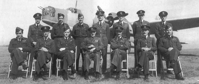 Mac, CO of the Warwick Conversion Unit, is sitting in the centre of the front row of this group photograph taken at RAF Docking in the summer of 1943. On his right is Flt Lt Tony Collins, responsible for navigation training. Next but one to Mac on his left is the Adjutant, Fg Off David Speeks. The aircraft behind the group is one of the unit’s ASR Warwicks.