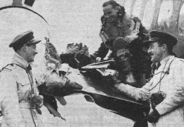 Регистрационный номер: N7266 [2] A close-up of the damage to Hudson N7266. Much of the starboard aileron and the area just inboard of it was blown apart by an anti-aircraft shell from the Scharnhorst. Leaning on the leading edge are Plt Off Lynn and air gunner Sgt Cliff.