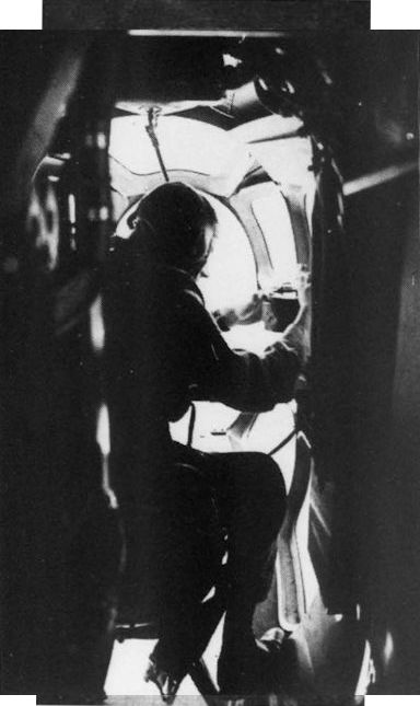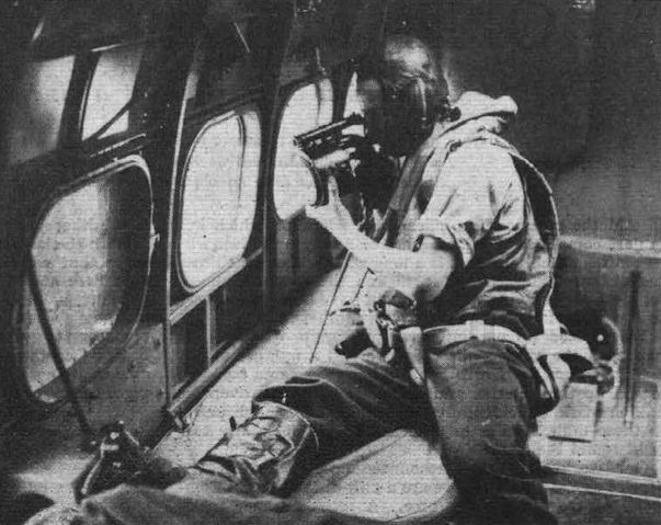 FEEDING THE GUNS: Threading ammunition belts of a thousand rounds each to the Brownings in the Hudson's rear turret. The bulge on the door contains the rubber dinghy, while on the left are seen racks for parachutes and Verey light cartridges. The well at the bottom of the fuselage is a retractable gun platform for tail protection.