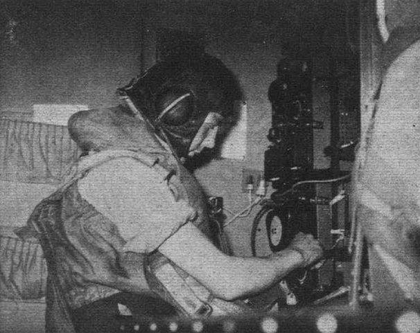 The wireless operator signals with an Aldis lamp to the other aircraft of the formation.