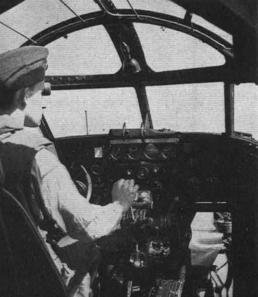 THE FORE END: A pilot at the controls of a Hudson. Note the row of bomb selector switches on the right of the lever marked "brake" and the navigator-bomb aimer's compartment in the nose.