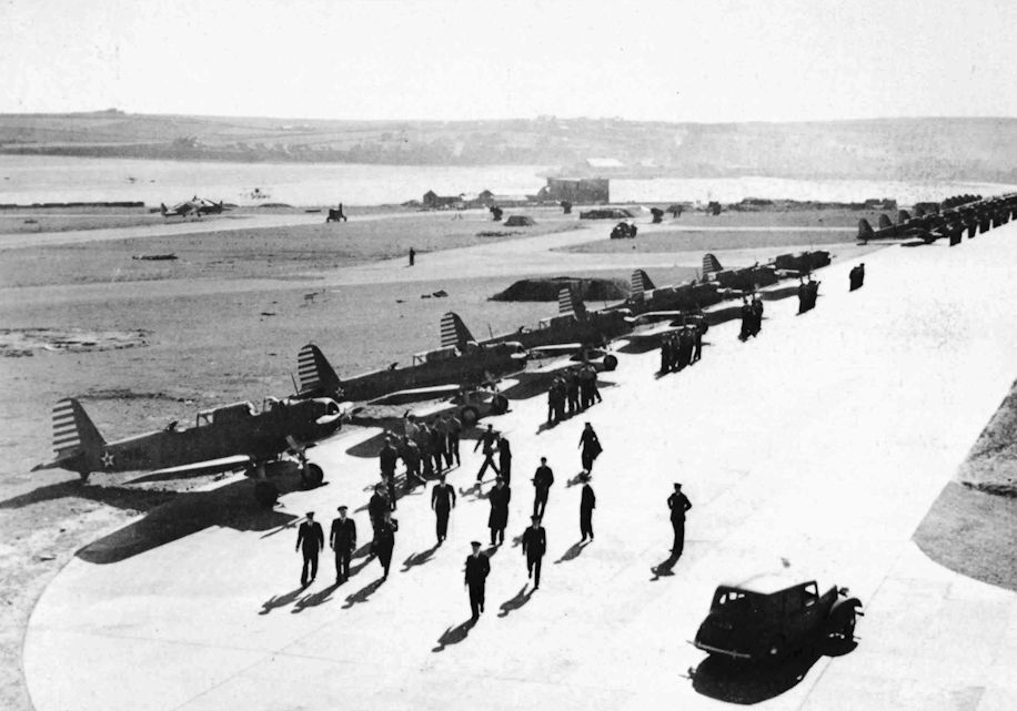 A certain divergance in design philosophy is evident in these two photographs of the eastern hangar area at Hatston. Here is the SB2U Vindicators from USS Wasp's Air Group disembarked while the carrier took Spitfires to Malta in May 1942.