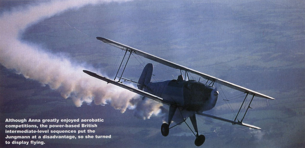 Регистрационный номер: G-BSAJ [7] Although Anna greatly enjoyed aerobatic competitions, the power-based British intermediate-level sequences put the Jungmann at a disadvantage, so she turned to display flying.