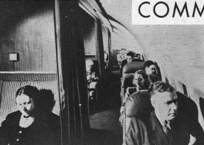 SUPERCHARGED PASSENGERS: A view inside the StratoClipper "Flying Cloud," looking aft. There is accommodation for 25 passengers by night and 33 by day. There is cargo space under the floor, which is placed high in the fuselage.