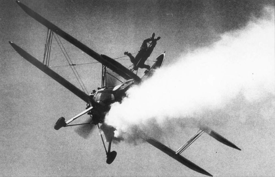 Pilot Jim Franklin and stuntman John Casey enthralling the Oshkosh crowds with their antics in - and on - a Waco.