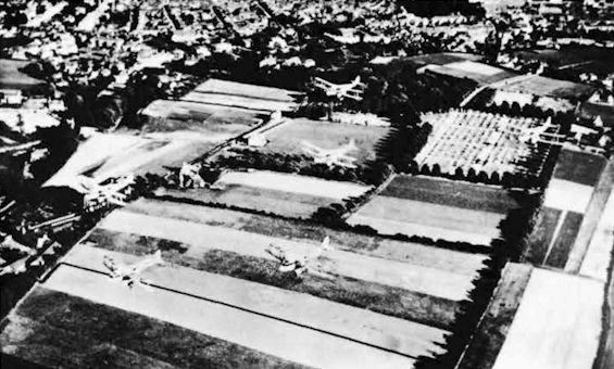 In the foreground is Gladiator K7960, in the background a D.H.86, DC-2, D.H.84 Dragon, DC-3 and an S.73, all diverted to Kenley because of bad weather.