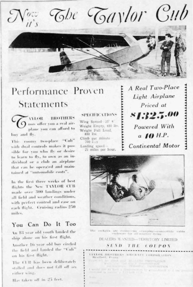 "Taylor Brothers Aircraft Corporation" развернула свой бизнес в США в конце 1920-х годов. Первым ее изделием стал самолет Taylor Chummy - легкий двухместный подкосный высокоплан с закрытой кабиной для двух человек, размещавшихся бок о бок.