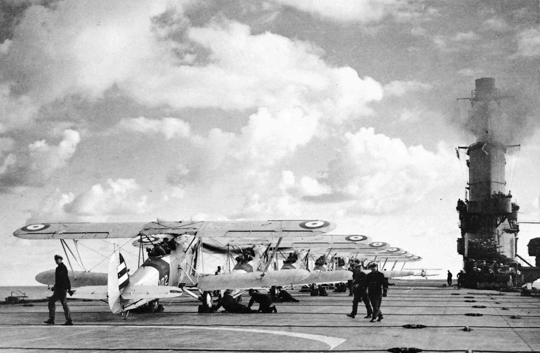 Hawker Ospreys operating from H.M.S. Glorious beneath a Mediterranean sky that has temporarily veiled its proverbial cloudlessness.
