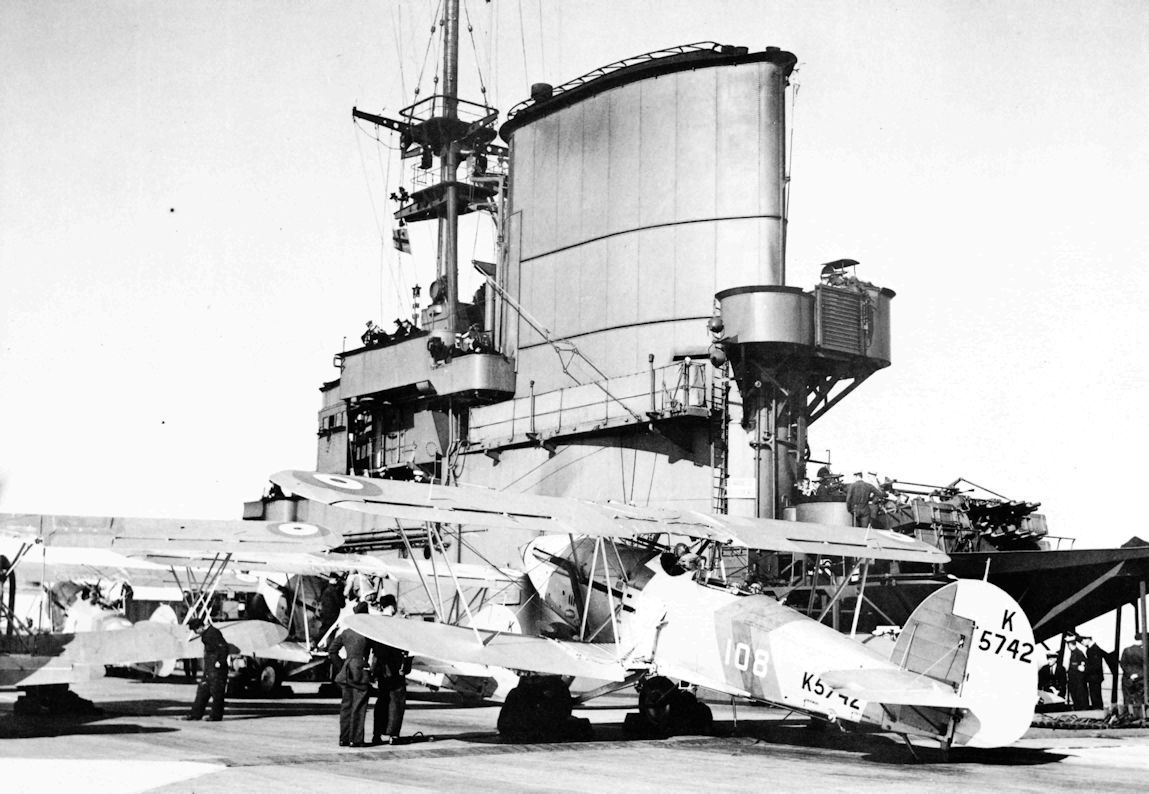 Регистрационный номер: K5742 The photograph was taken by Charles E. Brown and show the Ospreys of No.800 Squadron during working-up trials in March 1939. The details of the bridge shown give scale to the photos in the article. The Ark's bridge was by no means the massive affair one thinks of as being typical of a wartime carrier. Compared to the Illustrious class carriers, it is quite small, as shown by the people on the signal bridge. Aft of the funnel is the landing signal shutter which indicated the state of the deck to approaching aircraft. Below it is the 'Chicago Piano', or multiple pompom which was intended to make the fleet secure from aircraft for all time. K5742 has a camera gun in the lower wing and, pessimistically, all the Osprey IVs have hoisting-in strops on the centre sections. They may be there in case the aircraft is mounted on floats but in view of the number of carrier aircraft which had to be recovered from the sea, perhaps it is just to make salvage easier! On top of the mast is the dustbin, provided as a radio homing device to guide aircraft back to the carrier at night and in bad weather.