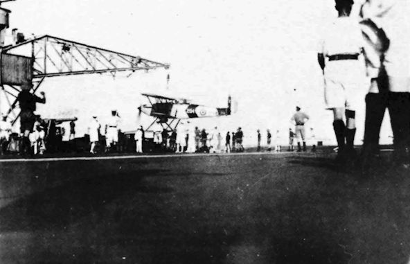A perfectly positioned photograph of a Hawker Osprey reconnaissance biplane with HMS Eagle in the background. -