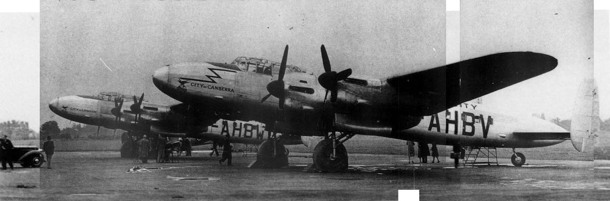 Регистрационный номер: G-AHBV [2], G-AHBW [3], VH-EAV [3] Two of Silver City's several Avro Lancastrians photographed early in 1947. Nearer the camera is G-AHBV City of Canberra, delivered new to the company in October 1946. Behind is G-AHBW City of London, delivered at the same time. Both were used mainly for charters between England, the Far East and Australia. The company sold 'BV in March 1949, 'BW having already been disposed of in January the previous year.