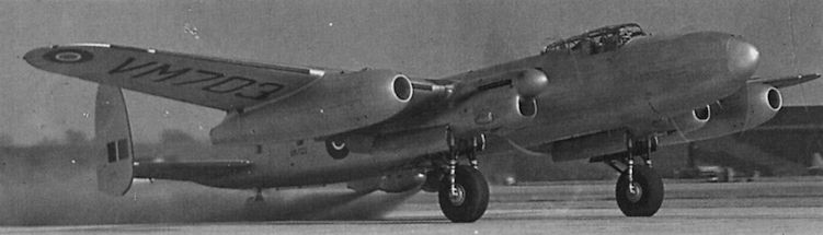 Регистрационный номер: VM703 [8] The first of two Avro Lancastrians used by de Havilland as testbeds for the Ghost engine was VM703, shown flying on the two Ghosts alone with propellers feathered on both Merlins.