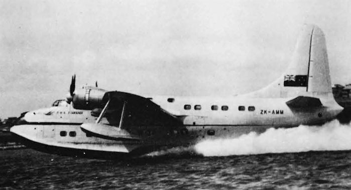 Регистрационный номер: ZK-AMO [4] Внизу: последний Solent 4 компании TEAL эксплуатировался до 1960 года - в последнее время он обслуживал только маршрут Фиджи - Таити. На снимке - ZK-AMO Aranui в районе Сувы, столицы Фиджи.