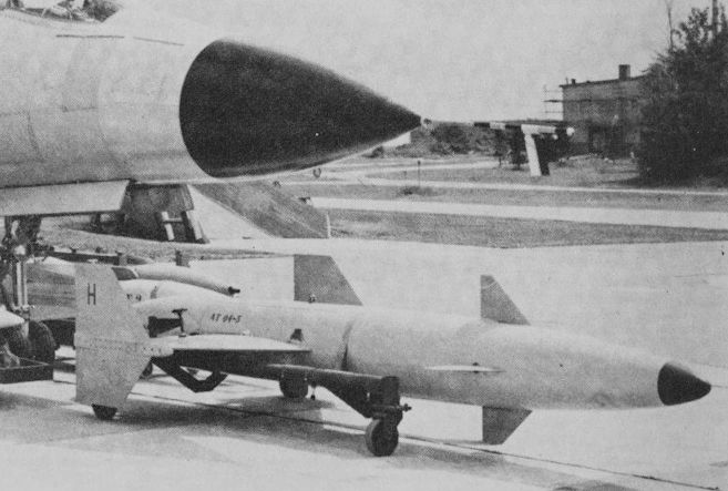 Saab RB04E air-to-surface guided missile mounted under belly of AJ 37 Viggen
