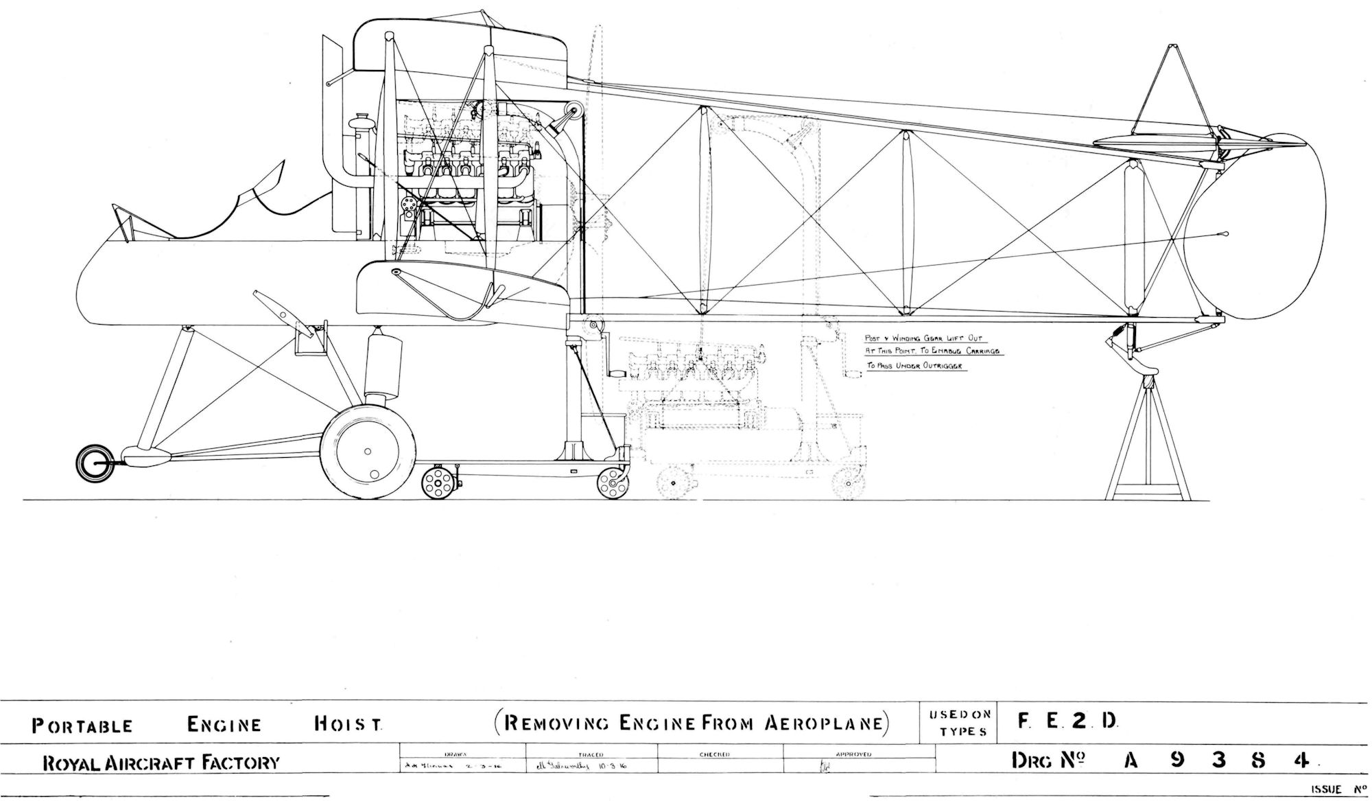 As a service to readers who are having difficulty in doing engine changes on their executive FE.2Bs, we show the method on the back cover. Having idly wondered how this was done amidst all those struts and wires for many years, it was interesting to come across an illustration of the purpose-built engine stand to be used.