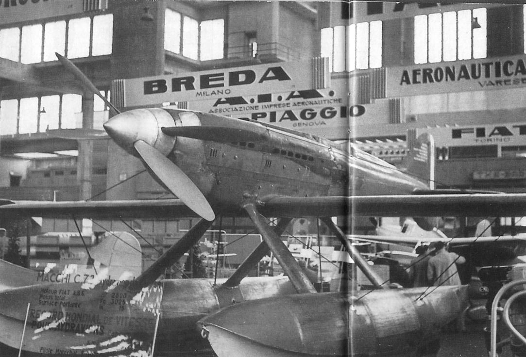Three examples of the remarcable Macchi-Castoldi MC.72 racing seaplane were built to compete in the 1931 Schneider Trophy race. Two crashed owing to problems with the Fiat AS.6 engine, and the Italians were forced to withdraw. Two years later, however, at Lake Carda on April 10, 1933, Lt Francesco Agello established a new absolute world speed record of 423.82 m.p.h. in an MC.72, subsequently raising this to 440.68 m.p.h. on October 23, 1934 This record was finally beaten by German's Heinkel He 112 in 1939, but it remained a speed record for seaplanes until 1961. The liquid-cooled 3,100 h.p. A.S.6 engine comprised a pair of twelve-cylinder AS.5s mounted nose-to-nose and driving contra-rotating propellers via coaxial propeller shafts.