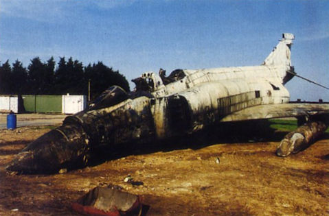 How the mighty are fallen. This burnt Phantom airframe illustrates the last military use of Manston - as the base for the MoD Fire Services Central Training Establishment.