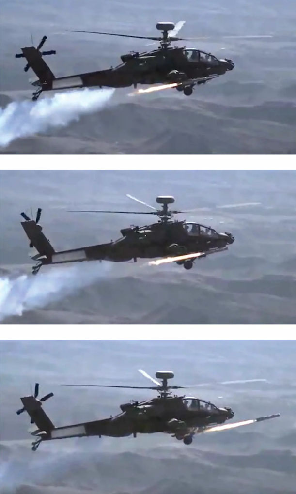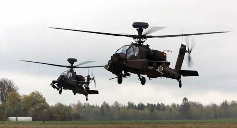 Each Apache is armed with two AGM-114 Hellfire missiles mounted under the left wing, along with unguided rockets and a 30mm M230 chain gun with 300 rounds.