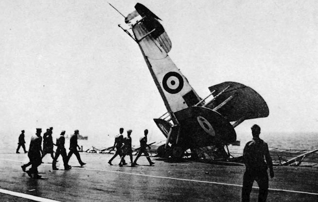 FLEET AIR ARM. Photographs of operational aircraft in service with the Fleet Air Arm between the wars are comparatively rare. Reader D. C. McKinnon of Padworth, Berkshire has submitted some fine "action" photographs of which these Avro Type 555 Bison Mk. IIs are but two. The Bison Mk. II was a four-seat deck-landing. Fleet Gunnery Spotter (one 450-h.p. Napier Lion Srs. II). From 1922-7. forty-one Bison Mks. I and II were built. Photo: A "runaway", crewless Bison (N959-) about to take the plunge;