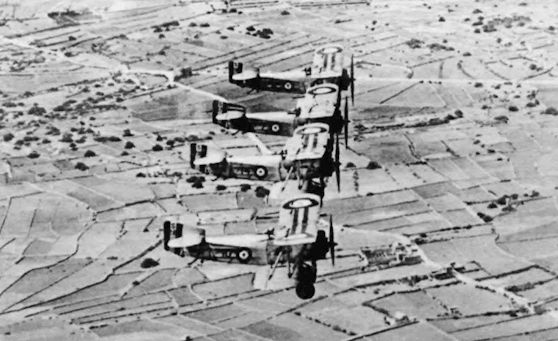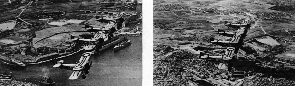 THE FLEET ABOVE: A Fairey Flycatcher (Jaguar engine) flying over Malta. Below can be seen the hangars of the seaplane station.