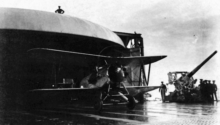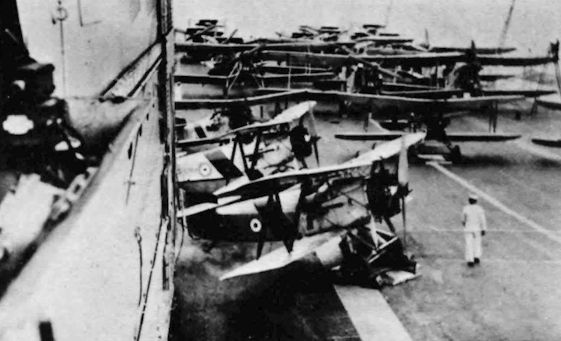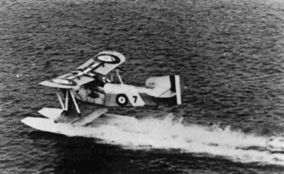 Регистрационный номер: S1272 While in harbour, a few aircraft were fitted with floats and hoisted outboard from the quarterdeck. They could then be used for target-towing and communications. S1272 (7) is an example as was S1279 (8).