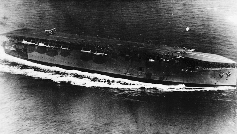 THE HORNET'S NEST: AN AERIAL VIEW OF THE AIRCRAFT CARRIER "COURAGEOUS." THE MACHINES RANGED ON THE FLYING DECK INCLUDE FAIREY "FLYCATCHERS" AND IIIF'S. NOTE THAT BOTH LIFTS ARE DOWN, PRESUMABLY TO FETCH MORE AIRCRAFT.